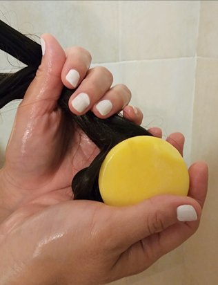 Moja tu cabello y la barra de acondicionador y frota la barra por mechones hasta cubrirlo todo. Deja actuar el producto sobre tu cabello por 3 minutos y enjuaga. Guarda la barra de Acondicionador en un lugar seco para conservarla.