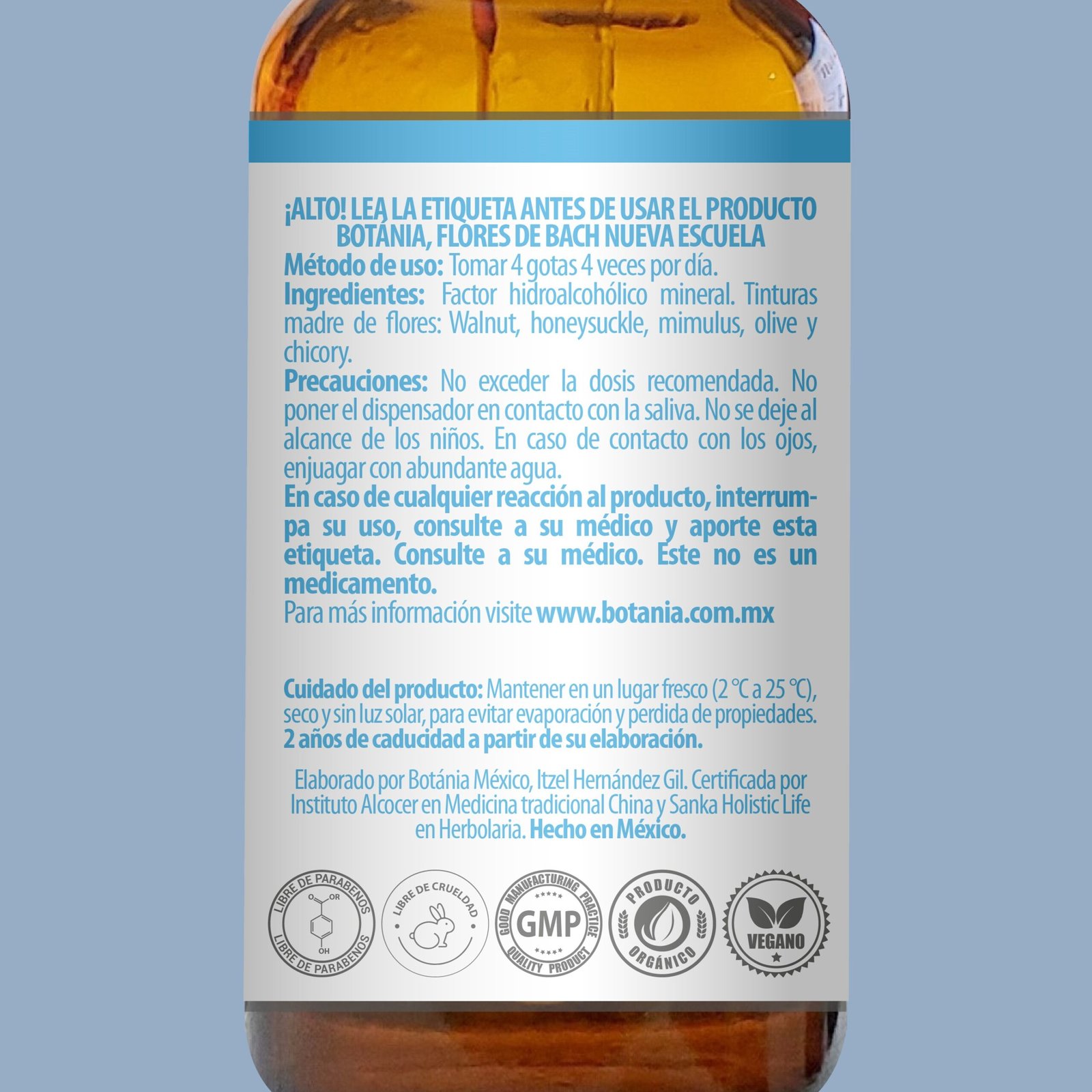No exceder la dosis recomendada. En caso de cualquier reacción al producto, interrumpa su uso, comuníquese con los asesores de Botánia o acuda al médico y proporcione la etiqueta. No poner el dispensador en contacto con la saliva. No se deje al alcance de los niños. En caso de contacto con los ojos, enjuagar con abundante agua.