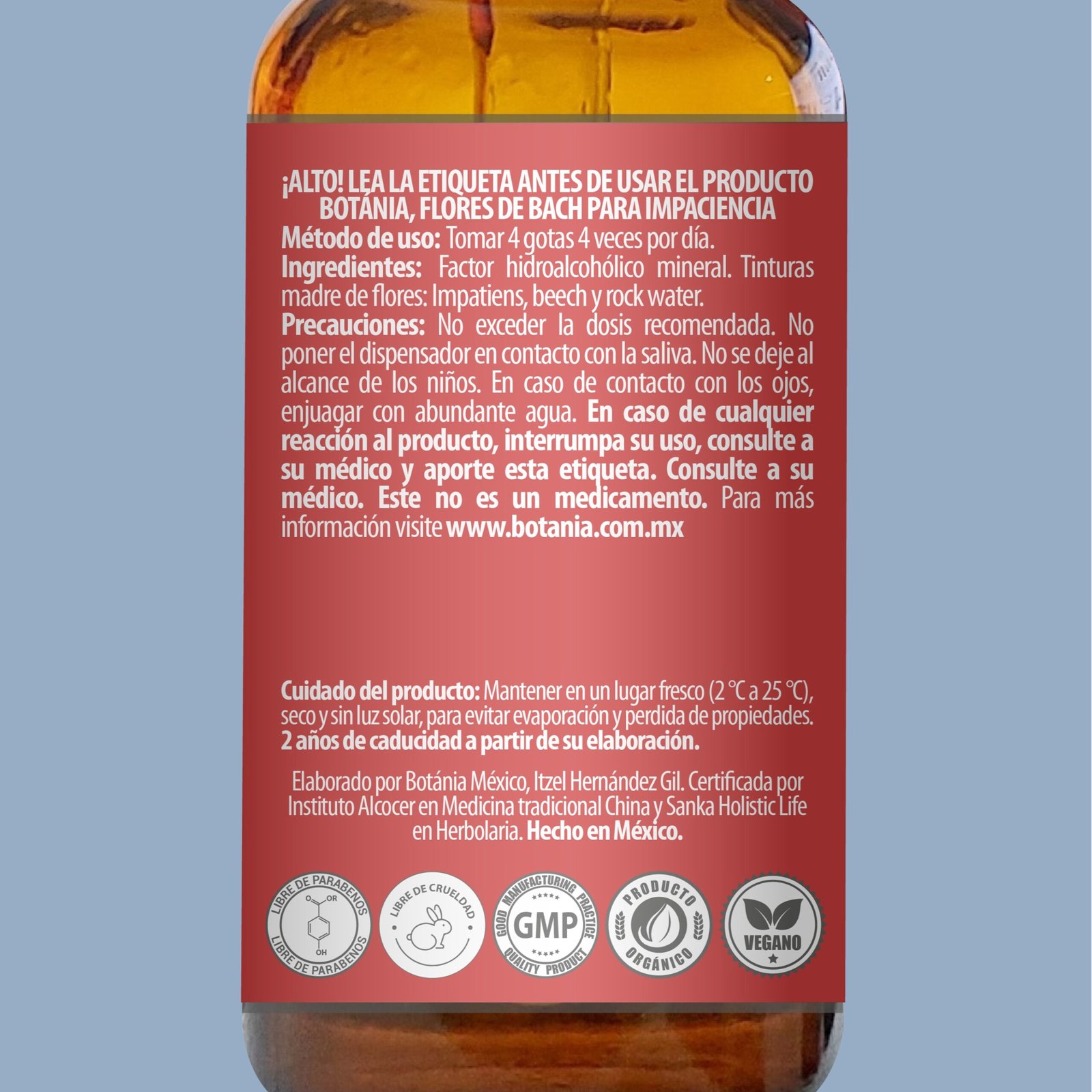 No exceder la dosis recomendada. En caso de cualquier reacción al producto, interrumpa su uso, comuníquese con los asesores de Botánia o acuda al médico y proporcione la etiqueta. No poner el dispensador en contacto con la saliva. No se deje al alcance de los niños. En caso de contacto con los ojos, enjuagar con abundante agua.