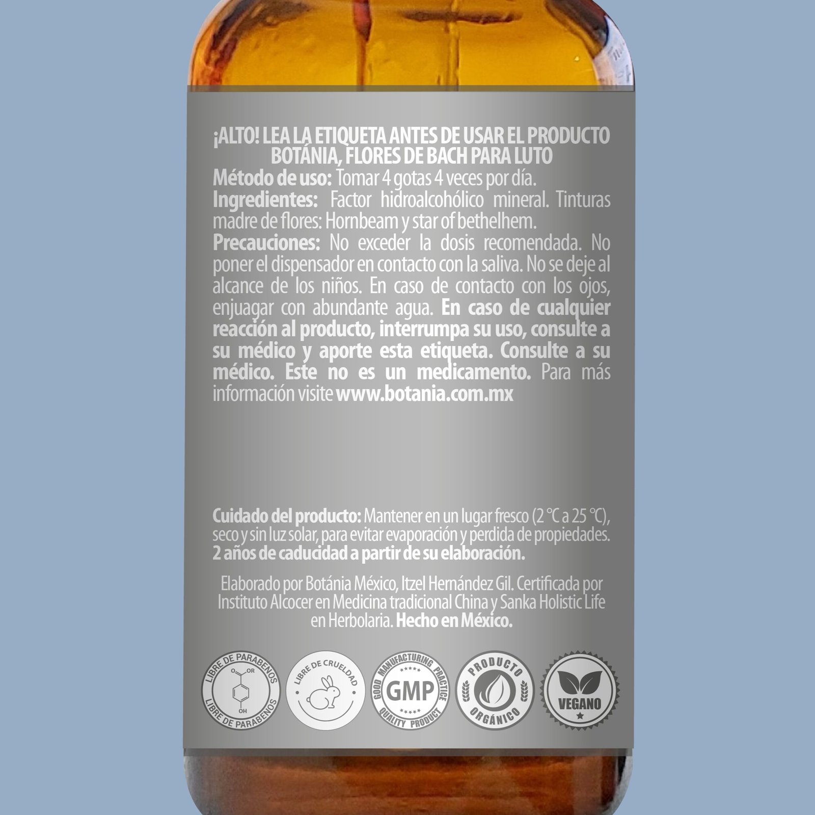 No exceder la dosis recomendada. En caso de cualquier reacción al producto, interrumpa su uso, comuníquese con los asesores de Botánia o acuda al médico y proporcione la etiqueta. No poner el dispensador en contacto con la saliva. No se deje al alcance de los niños. En caso de contacto con los ojos, enjuagar con abundante agua.