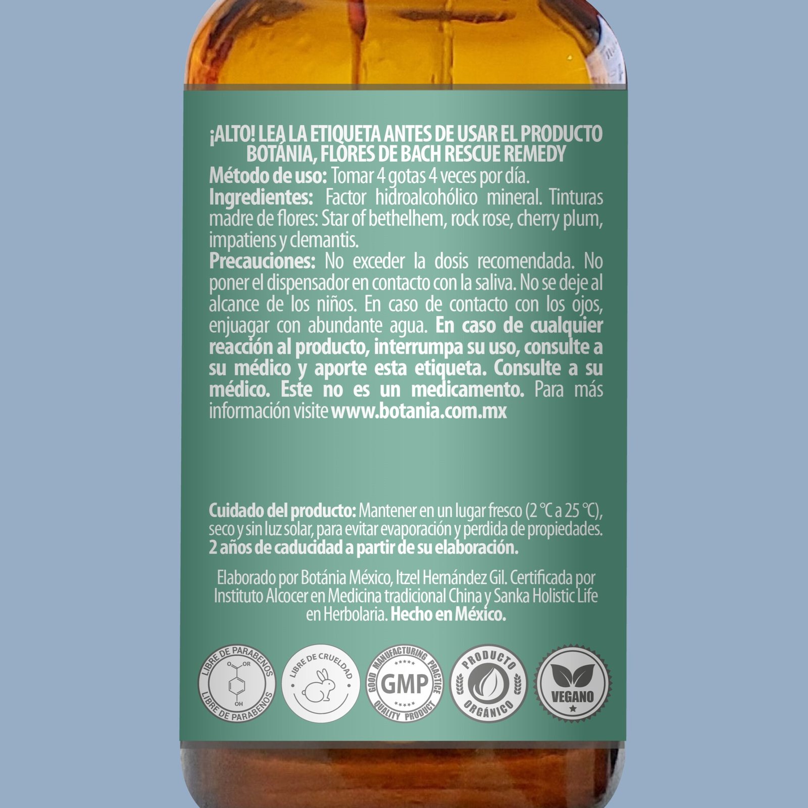 No exceder la dosis recomendada. En caso de cualquier reacción al producto, interrumpa su uso, comuníquese con los asesores de Botánia o acuda al médico y proporcione la etiqueta. No poner el dispensador en contacto con la saliva. No se deje al alcance de los niños. En caso de contacto con los ojos, enjuagar con abundante agua.